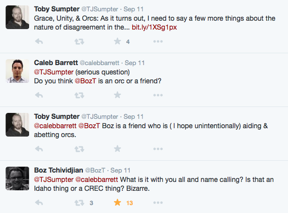 This is the context: Sumpter was calling those who disagreed with him “orcs.” Or to be more specific, Sumpter’s actual words were, “orcs, hags, and trolls,” “a mob of angry orcs,” and “orcs…screaming for blood.” In other words, Sumpter chose to focus on the handful of bottom-of-the-barrel internet commenters that every blog has instead of the sincere, thoughtful critics like Tchividjian, Sloan, Hart, and Julie Anne Smith — even Michael Reagan and Jefferson Bethke. (You can even go look at my previous posts on the subject; I have not used a single personal insult and I have not name-called once.) And then he chose to smear the sincere, thoughtful critics by pretending there was little difference between the groups. And to this I responded with the aforementioned comment: