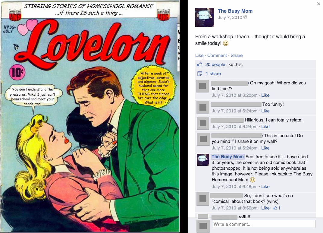 My concern with St. John centers on two things: first, her use of the comic book image makes me concerned about what she teaches regarding sex and consent, and second, her treatment of HA and HARO on her facebook wall makes me concerned about how her homeschool co-op ministry addresses (or does not address) things like abuse or neglect.