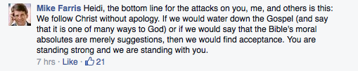 Heidi, the bottom line for the attacks on you, me, and others is this: We follow Christ without apology. If we would water down the Gospel (and say that it is one of many ways to God) or if we would say that the Bible’s moral absolutes are merely suggestions, then we would find acceptance. You are standing strong and we are standing with you.