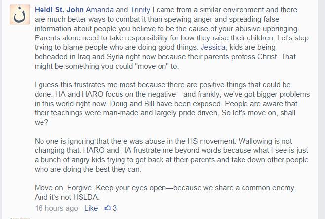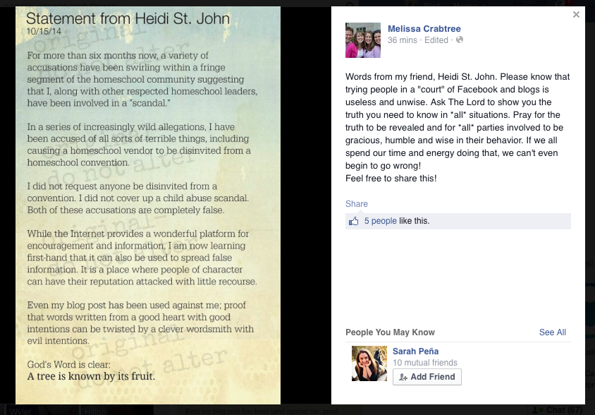 The statement alleged to be St. John’s was posted on Facebook by Melissa Crabtree (image archived here). Crabtree is Heidi St. John’s virtual assistant. St. John herself has not posted this statement on any of her publicly accessible social media accounts. We have repeatedly attempted to contact St. John — both to verify this statement’s authenticity and to give her the opportunity to comment on our “When Homeschool Leaders Looked Away” piece prior to publication — but she has refused to respond. (Update, 10/18/2014: Heidi St. John has finally confirmed the statement’s authenticity and posted it on her Facebook page.) However, numerous factors indicate the statement is authentic, so we are sharing it here: