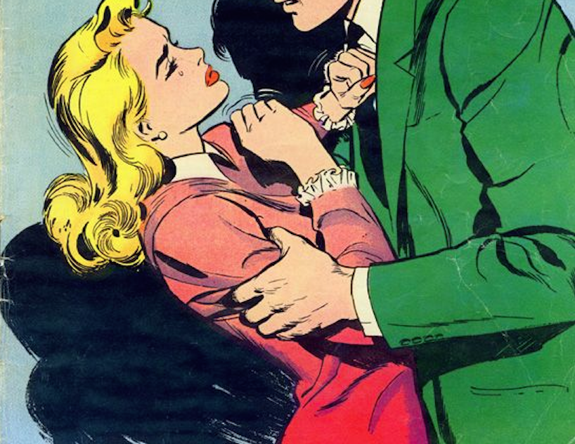 The image, the text of which St. John altered, comes from an old comic that depicts a chauvinistic man sexually assaulting his frigid boss (an action that leads to her marrying him). A close-up of the image makes clear the woman is terrified and crying: